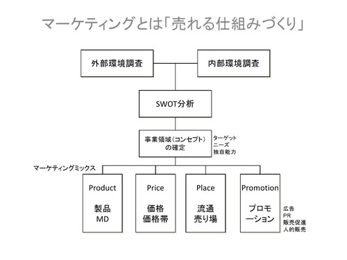 実際にアメリカから輸入されるマーケティングという概念の中には、たくさんの横文字言葉があります。いってみれば業界用語ですが、マーケティングの本質はその横文字言葉の多用や暗記ではありません。様々なビジネス要素を組み合わせて、売れる仕組みをいかに作るかということです。